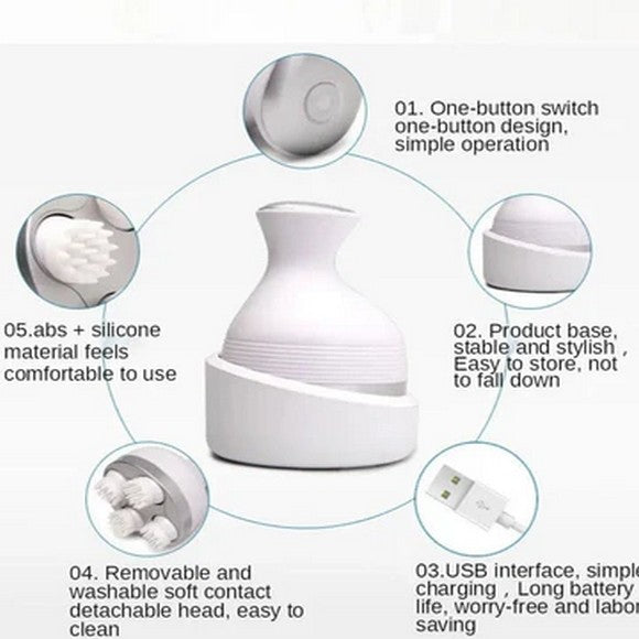 This hand held head massager has two shifting and two way rotation for comfort. The silicon massage head adopts bionic design it offers you the lowest noise. It work clockwise and anti clockwise massage direction for quick switch and each direction has 2 massage speed. It effectively promote blood circulation on your scalp to relieve and eliminate the tension and pressure. It provide a standing base with non slip pads on the bottom to enhance placement stability and the built in rechargeable battery can be directly powdered for continues enjoyment and cordless operation.